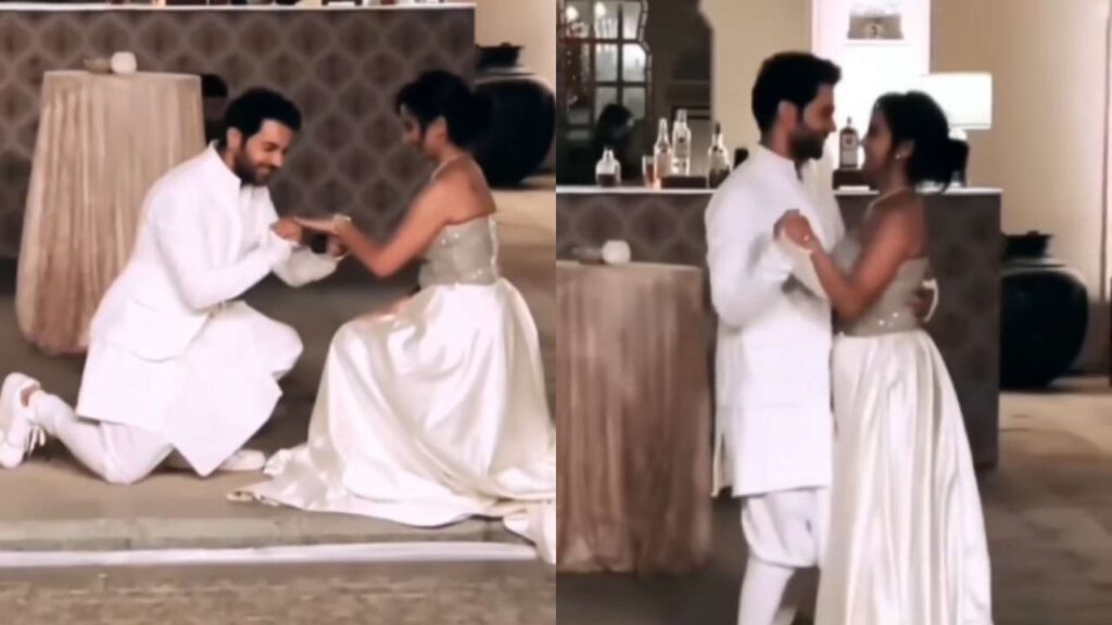 In the video, Rajkumar is seen kneeling while his bride-to-be says yes. The two then dance together while the guests applaud for them. Actor Salim and director Farah Khan also attended the celebration.