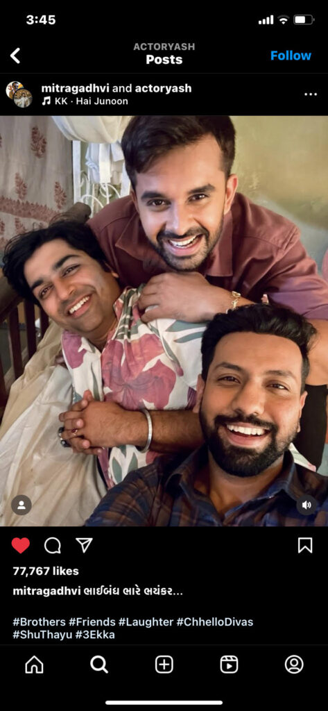 Mitra Gadhvi, in the movie, posted a boomerang video with his co-actor Tarjanee Bhadla on Instagram with the caption, “Since 5:00 am! #3Ekka Day2 is still going strong.”
