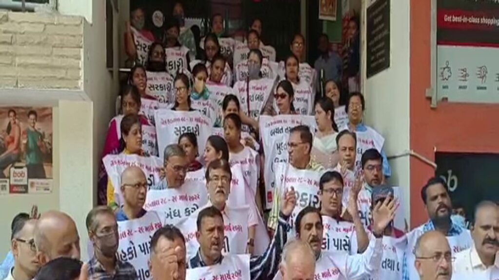As many as 500 bank employees gathered outside the Bank of Baroda office near Jubilee in Rajkot, chanting slogans, including 22 demands. Shouts include the resumption of the old pension scheme with inflation. If the government does not accept the demand, there is a threat of more agitation in the coming days.