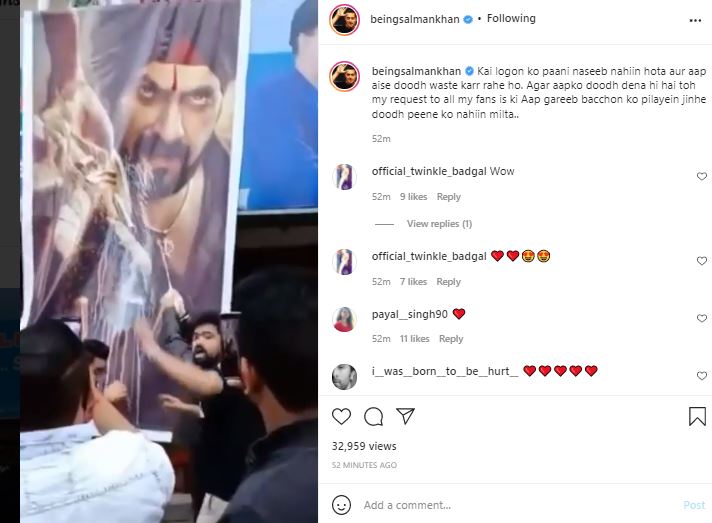Salman Khan posted a video of his fans bathing in milk a large poster of his film Antim: The Final Truth.