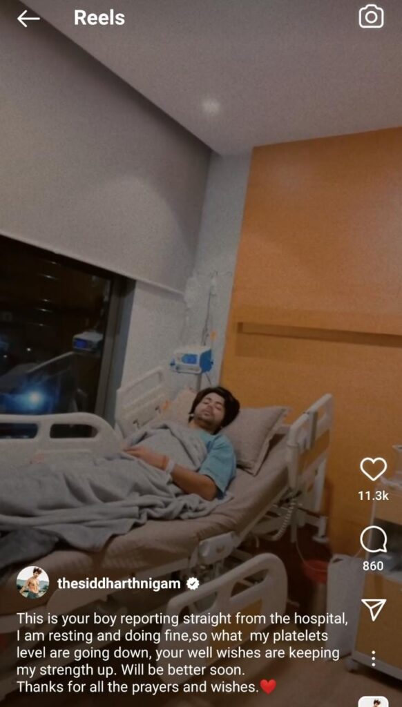 He is in under observation for the past few days. Today with his Instagram reel his fans came to know that Siddharth Nigam’s platelets are down